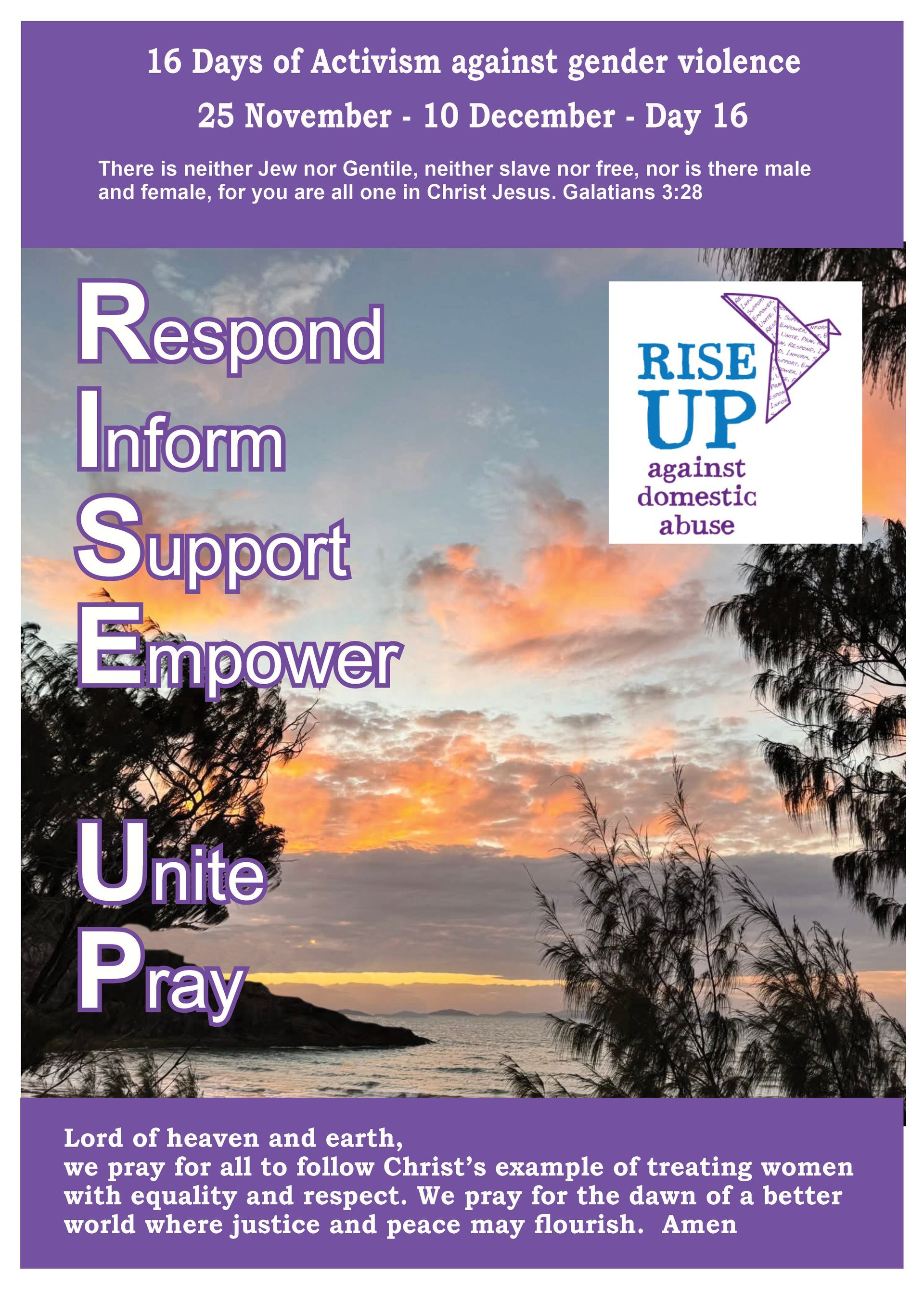 Almighty God, we pray for all those throughout the world who are victims and survivors of domestic abuse. May there be an end to this terrible suffering. Please heal, renew and guard them. We ask that they will bring their cares to you and that they will know the peace that passes all understanding. Amen.