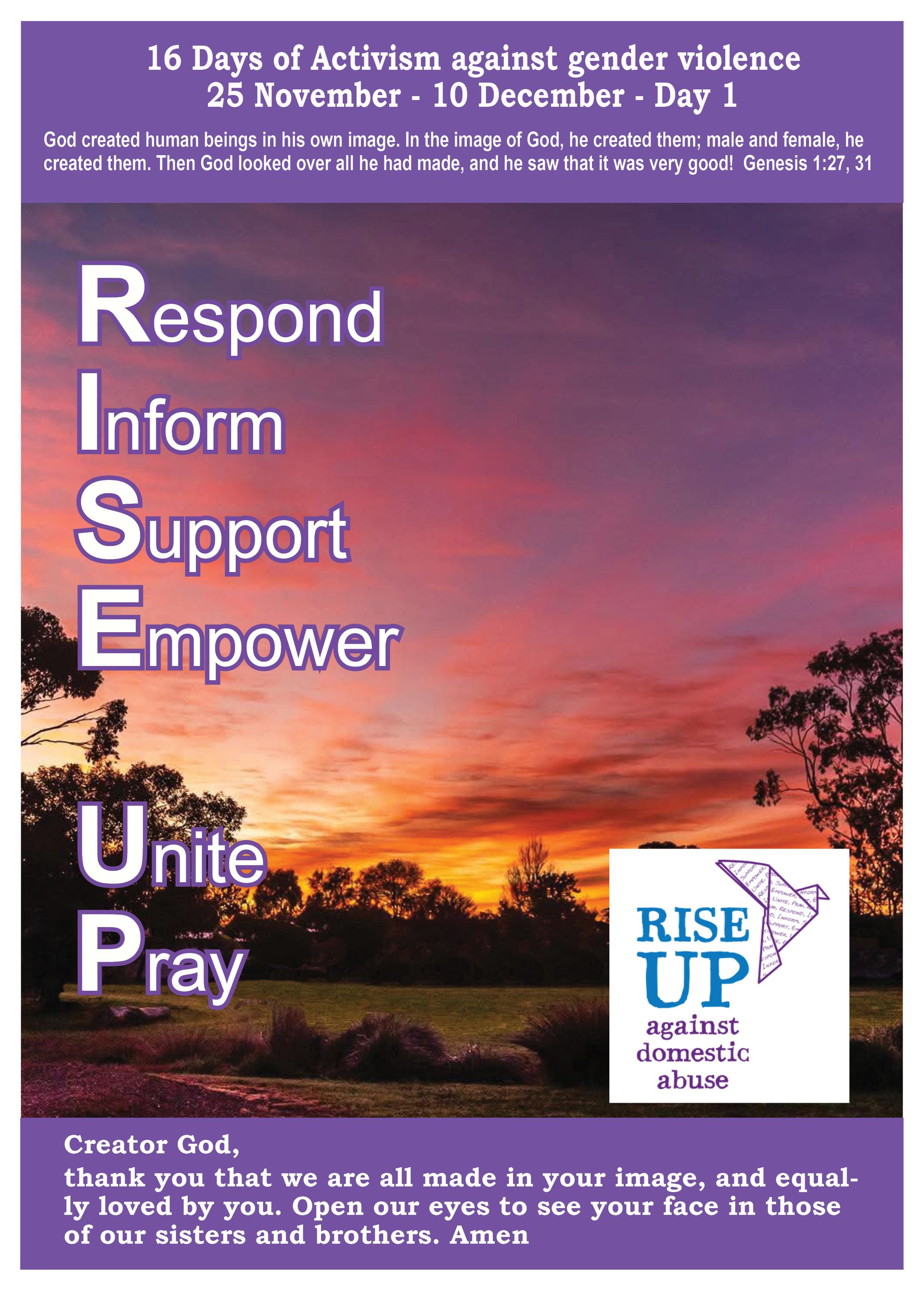 Day 1 – Genesis 1:27, 31 - God created human beings in his own image. In the image of God, he created them; male and female, he created them. Then God looked over all he had made, and he saw that it was very good! Creator God, thank you that we are all made in your image, and equally loved by you. Open our eyes to see your face in those of our sisters and brothers. Amen